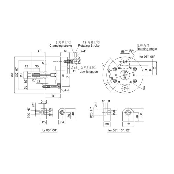 | Spec Model | Max clamping force kgf | Max RPM | I kg*m2 | Weight kg | Matched cylinders | Max Pressure Mpa(kgf) |